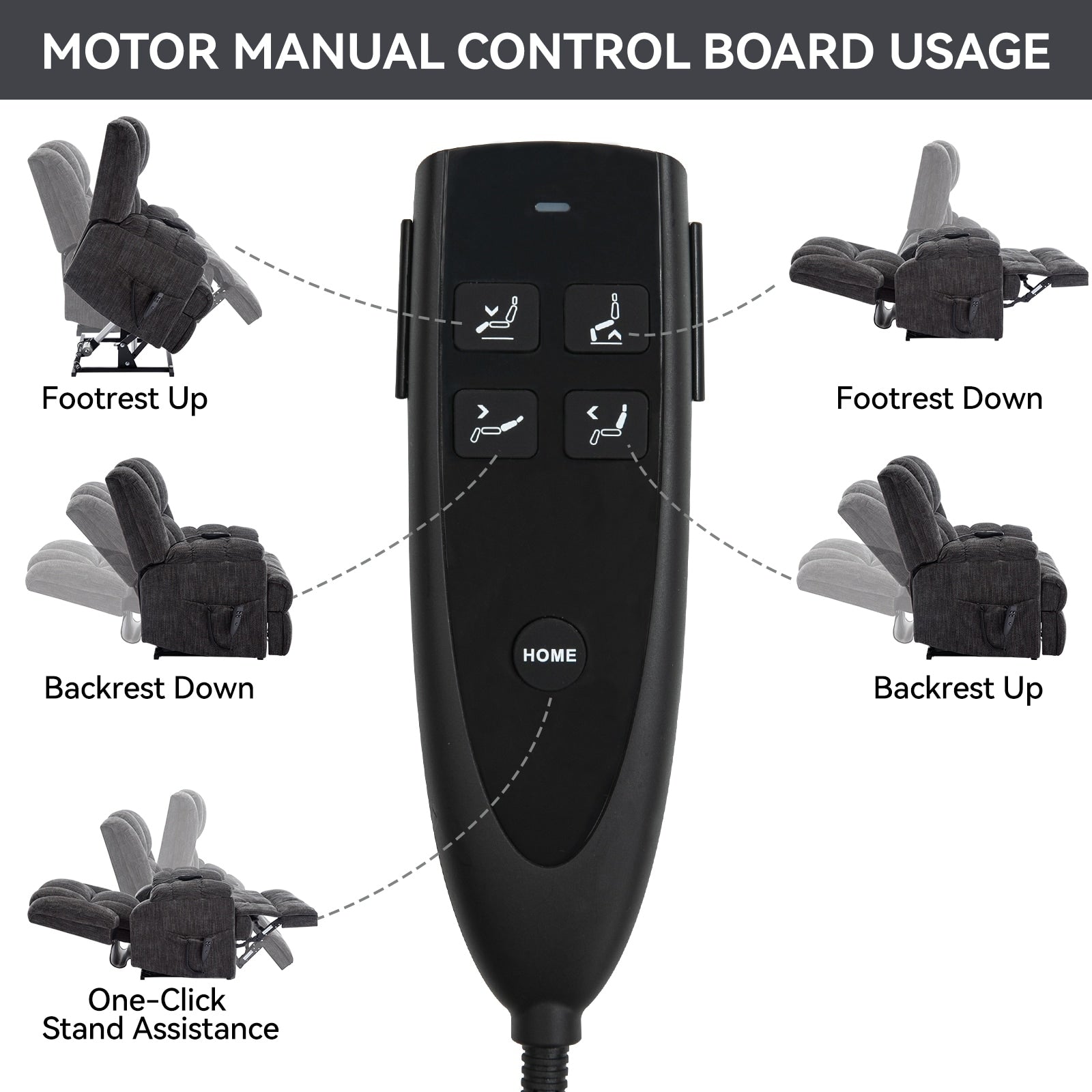 • Fauteuil releveur électrique à double moteur : Ce fauteuil est équipé d'un système à double moteur permettant un contrôle indépendant du dossier et du repose-pieds. D'une simple pression sur la télécommande, vous pouvez incliner le fauteuil à près de 180 degrés ou activer la fonction releveur, qui vous aide à vous lever en douceur et en silence. Idéal pour les personnes âgées, celles souffrant de problèmes d'équilibre aux jambes ou au dos, ou celles qui se remettent d'une opération.